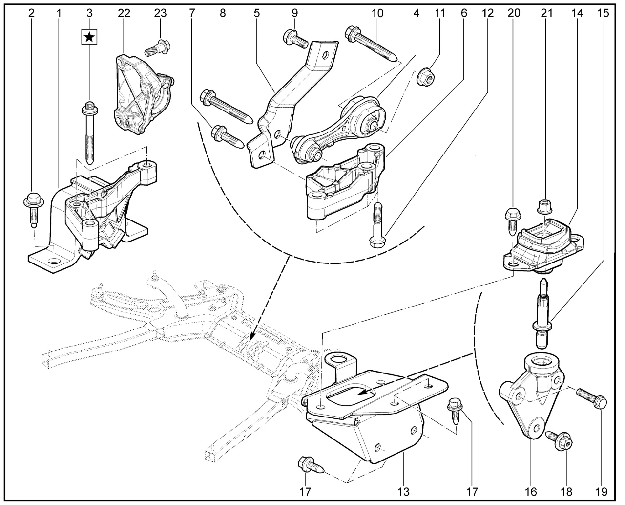 | 14 | Опора передняя левая для крепления двигателя к кузову | 8200395661 | |
