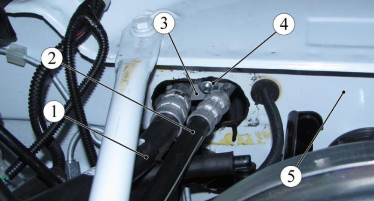 Извлечь из панели 5 щитка передка, рисунок 4-2, заглушку трубопроводов низкого 1 и высокого 2 давления системы кондиционирования (отвертка плоская).