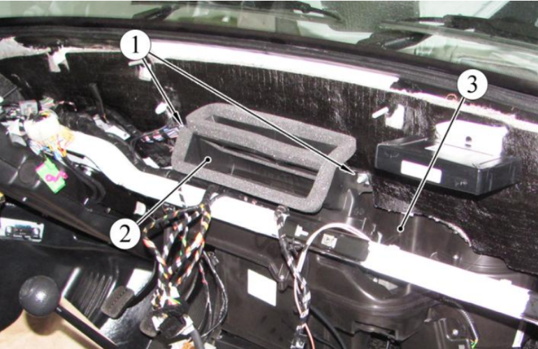 Рисунок 4-4 – Распределитель воздушных потоков: 1 – гайка крепления распределителя воздушных потоков; 2 – распределитель воздушных потоков; 3 – блок отопителя и испарителя