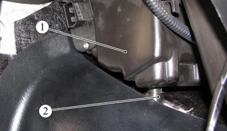 Рисунок 4-5 – Слив конденсата: 1 – блок отопителя и испарителя; 2 – трубка слива конденсата