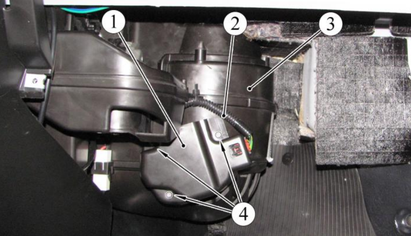 Рисунок 5-1 – Микромоторедуктор заслонки рециркуляции: 1 – кожух микромоторедуктора; 2 – жгут проводов отопителя; 3 – блок отопителя и испарителя; 4 – винт крепления кожуха и микромоторедуктора