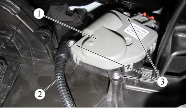 Рисунок 5-2 – Микромоторедуктор заслонки отопителя: 1 – микромоторедуктор; 2 – жгут проводов отопителя; 3 – винт крепления микромоторедуктора