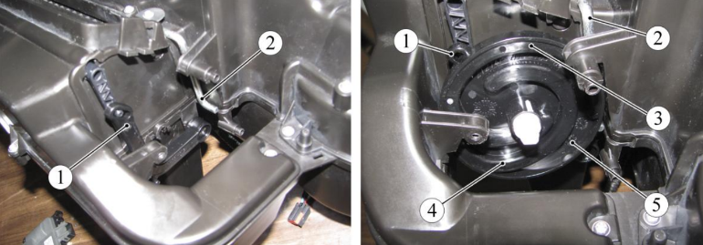 Рисунок 5-4 – Установка микромоторедуктора заслонок воздухораспределения: 1 – рычаг привода заслонок воздухораспределения; 2 – рычаг привода заслонки обогрева ветрового стекла; 3 – направляющая дорожка привода заслонки обогрева ветрового стекла; 4 - направляющая дорожка привода заслонок воздухораспределения; 5 – распределитель воздухообогрева