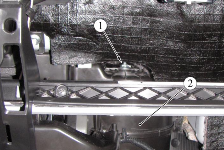 Рисунок 5-7 – Крепление электродвигателя системы вентиляции, отопления и кондиционирования: 1 – гайка крепления электродвигателя; 2 – корпус блока отопителя и испарителя