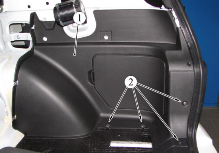 Отвернуть винты 3 крепления обивки 1 боковой панели, снять обивку, продев ленту ремня безопасности в отверстие панели, для левой обивки дополнительно отсоединить колодки жгута проводов от плафона освещения багажника, розетки и концевого выключателя двери задка (отвертка крестообразная).
