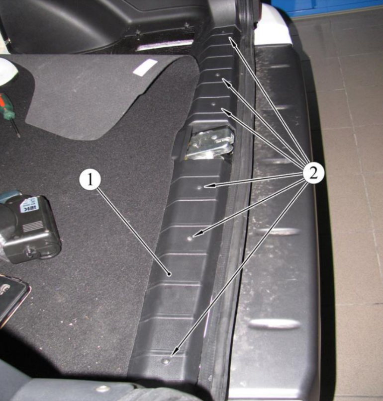 Рисунок 7-6 – Облицовка порога двери задка: 1 – облицовка порога двери задка; 2 – винт крепления облицовки