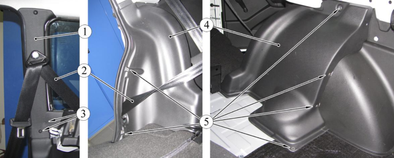Рисунок 7-7 – Крепление обивки арки колеса (2131): 1 – обивка задней стойки; 2 – ремень безопасности; 3 – винт крепления обивки задней стойки; 4 – обивка арки колеса; 5 – винт крепления обивки арки