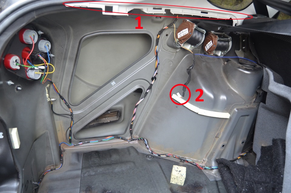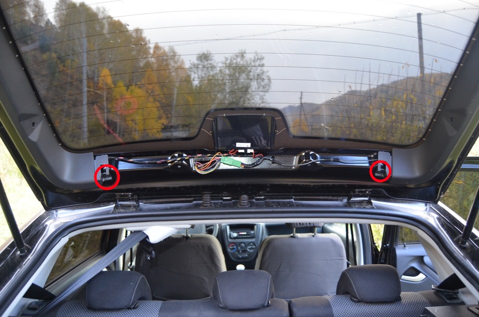 - Вывернуть 2 винта крепления ручек закрывания багажника. Снять основную обшивку крышки багажника, вывернув 2 винта крепления и отщелкивая 8 клипс.