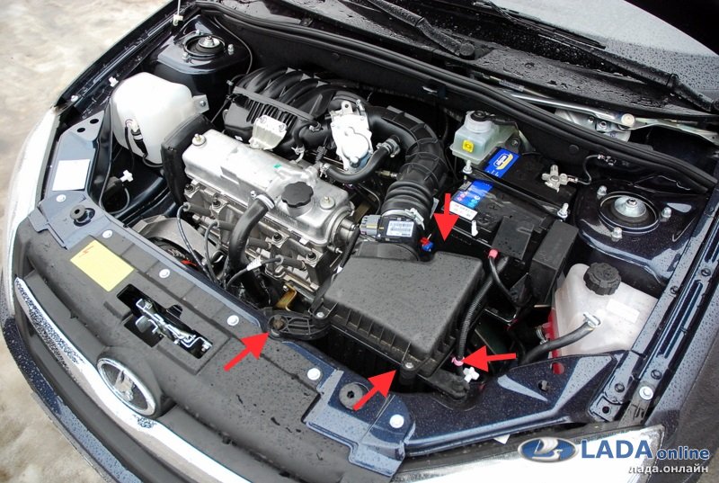 Для более удобного доступа к левой фаре (по ходу движения автомобиля) рекомендуется сдвинуть корпус воздушного фильтра двигателя в сторону, освобождая все его крепления, жгут проводов и датчик.