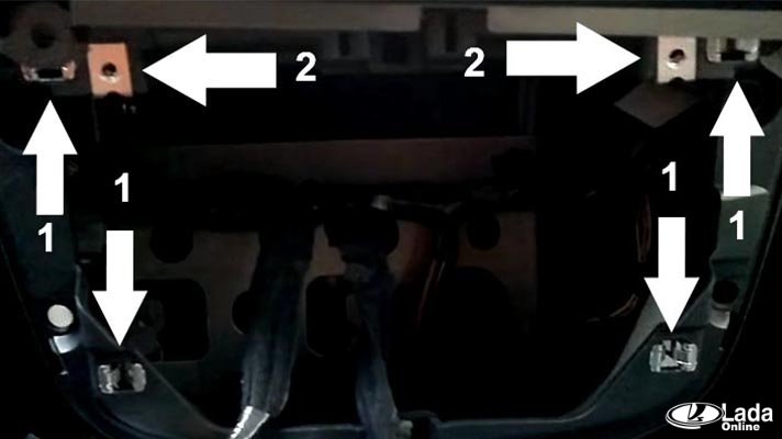 На фото представлена общая схема креплений центральной накладки панели новой Калины. Красным цветом отмечены клипсы, который просто отщелкиваются под действием усилий. Синим - винты крепления, которые следует вывернуть отверткой.