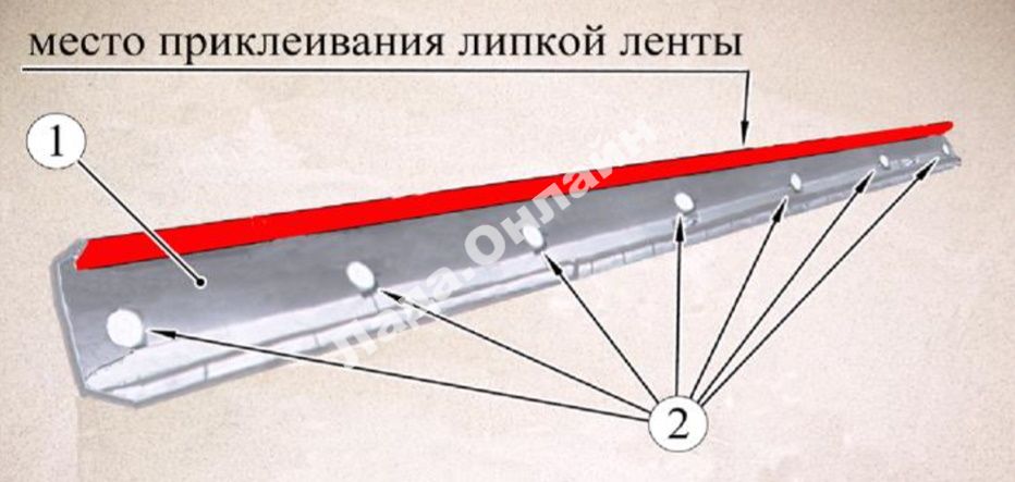 Рисунок 6-4 – Схема приклеивания липкой ленты на обтекатель порога: 1 – обтекатель порога; 2 – клипса крепления обтекателя