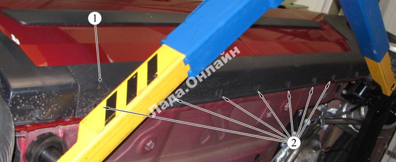 Рисунок 6-3 – Точки крепления обтекателя порога: 1 – обтекатель порога; 2 – пистон крепления обтекателя порога
