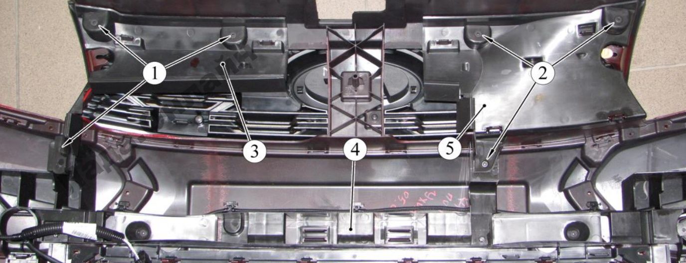 Отвернуть два винта 4, рисунок 3-7, крепления решетки 3 бампера, к бамперу (головка сменная Torx Т20, вороток).