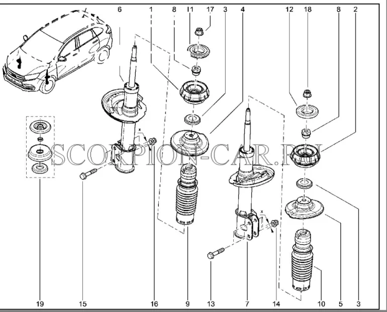В передней и задней подвесках Lada XRAY и Largus установлены телескопические гидравлические газонаполненные амортизаторные стойки. В ходе эксплуатации их приходится менять на новые. Процесс их замены на XRAY и Largus аналогичен, т.к. оба автомобиля выпускаются на одной производственной линии B0.