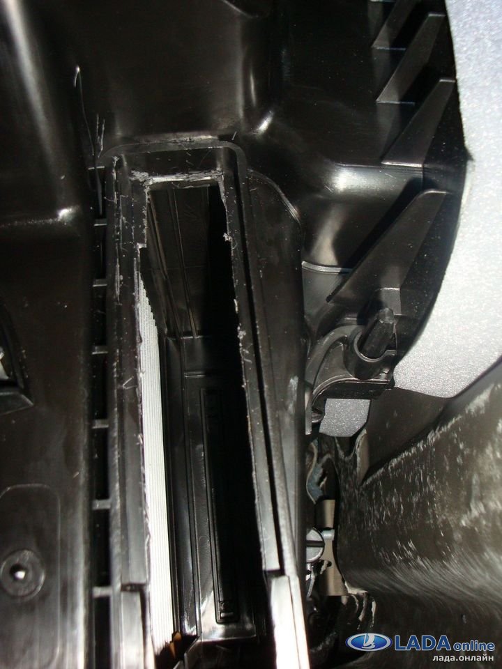 Фильтр салона Лада Ларгус в сборе, это означает, что вместе с фильтром есть и новая заглушка. Салонный фильтр больше сделанного отверстия, поэтому при его установке необходимо фильтрующий элемент сжать. Вставляем сначала верхнюю часть фильтра, а затем защёлкиваем нижнюю часть. Весь процесс не займет у более 30-40 минут видео, а момент снятия и установки воздушного фильтра можно проследить на видео: