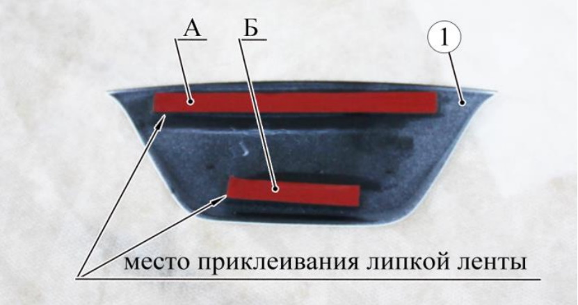 Рисунок 6-15 – Схема приклеивания липкой ленты на накладку заднего фонаря: А, Б – участок приклеивания двусторонней липкой ленты; 1 – накладка заднего фонар