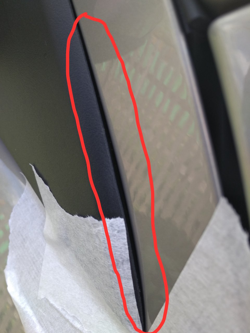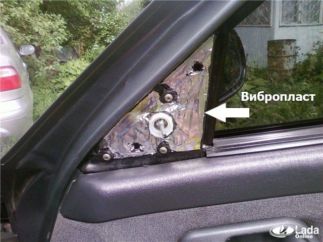 Также может помочь доработка места крепления, наклеиваем шумоизоляционный материал (например, вибропласт или СПЛЭН) на треугольную часть зеркала и дверь.
