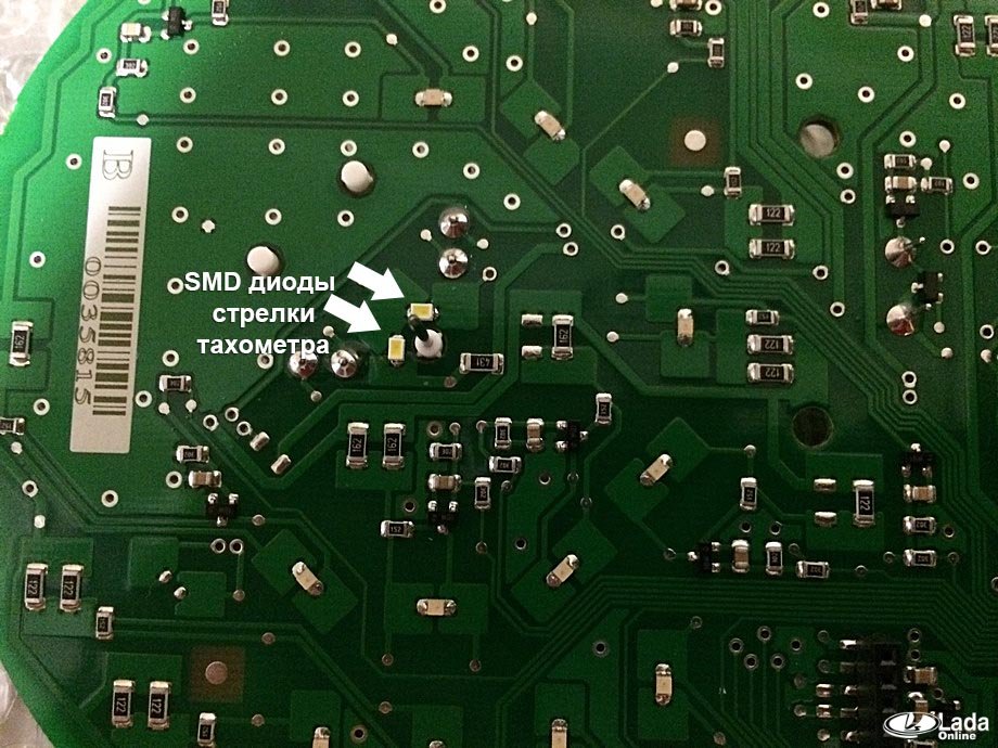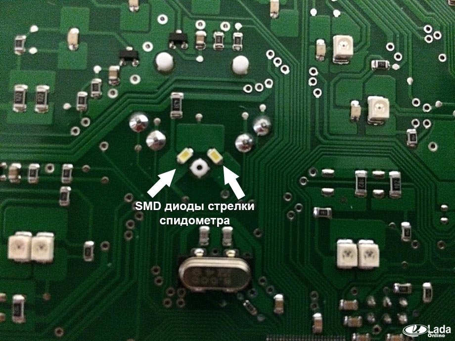 Для подсветки шкал спидометра, тахометра, стрелок, БК и других показаний используются SMD светодиоды. Некоторые из них показаны на фото: