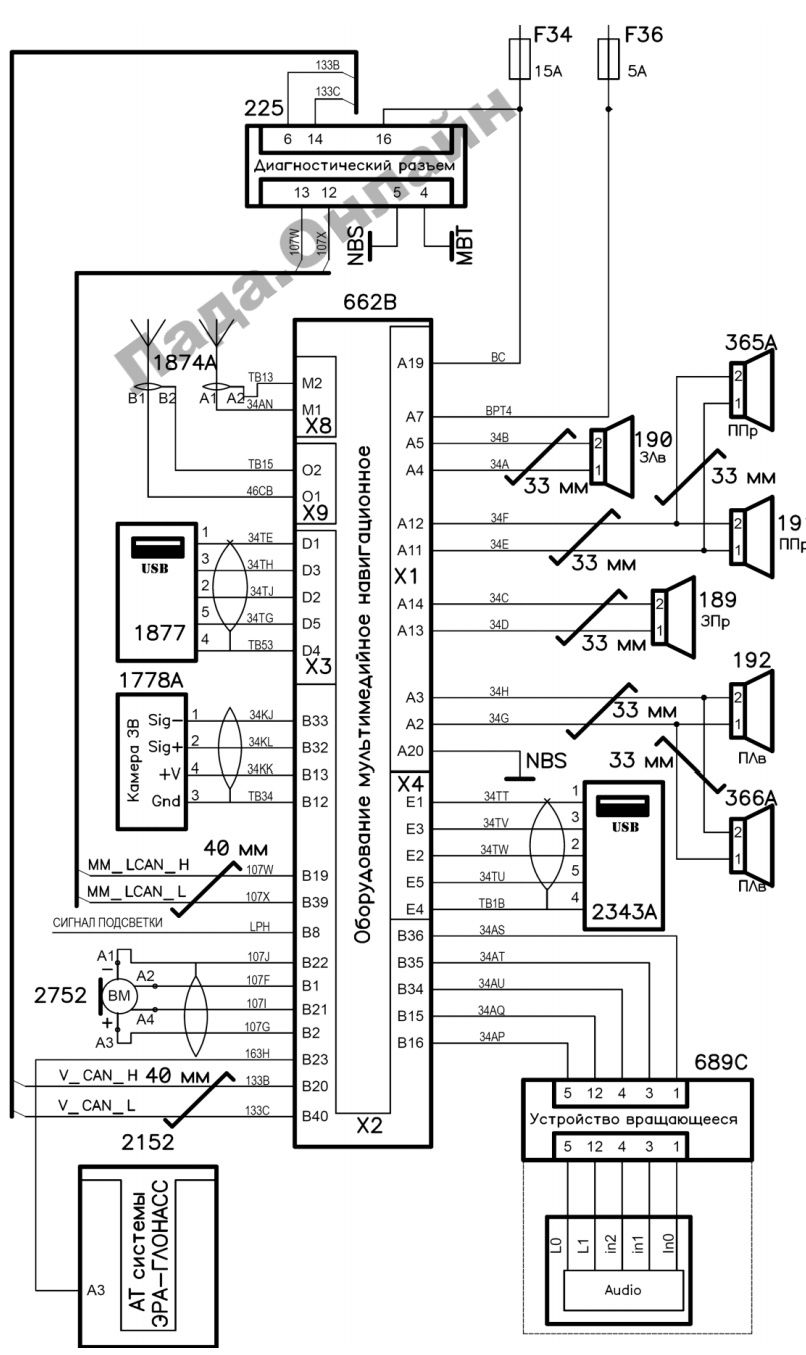 Принципиальная схема подключения ММС автомобилей XRAY: 189 – громкоговоритель задний правый; 190 – громкоговоритель задний левый;191 – громкоговоритель передний правый; 192 – громкоговоритель передний левый; 225 – диагностический разъём; 365A – громкоговоритель высокочастотный правый; 366A – громкоговоритель высокочастотный левый; 662B – оборудование мультимедийное навигационное (IVI); 689С – устройство вращающееся; 1778А – камера заднего вида; 1874А – антенна комбинированная; 1877 – разъём USB (мультимедиа); 2152 – автомобильный терминал системы "ЭРА-ГЛОНАСС"; 2343А – разъём USB (модем); 2752 – микрофон аудиосистемы