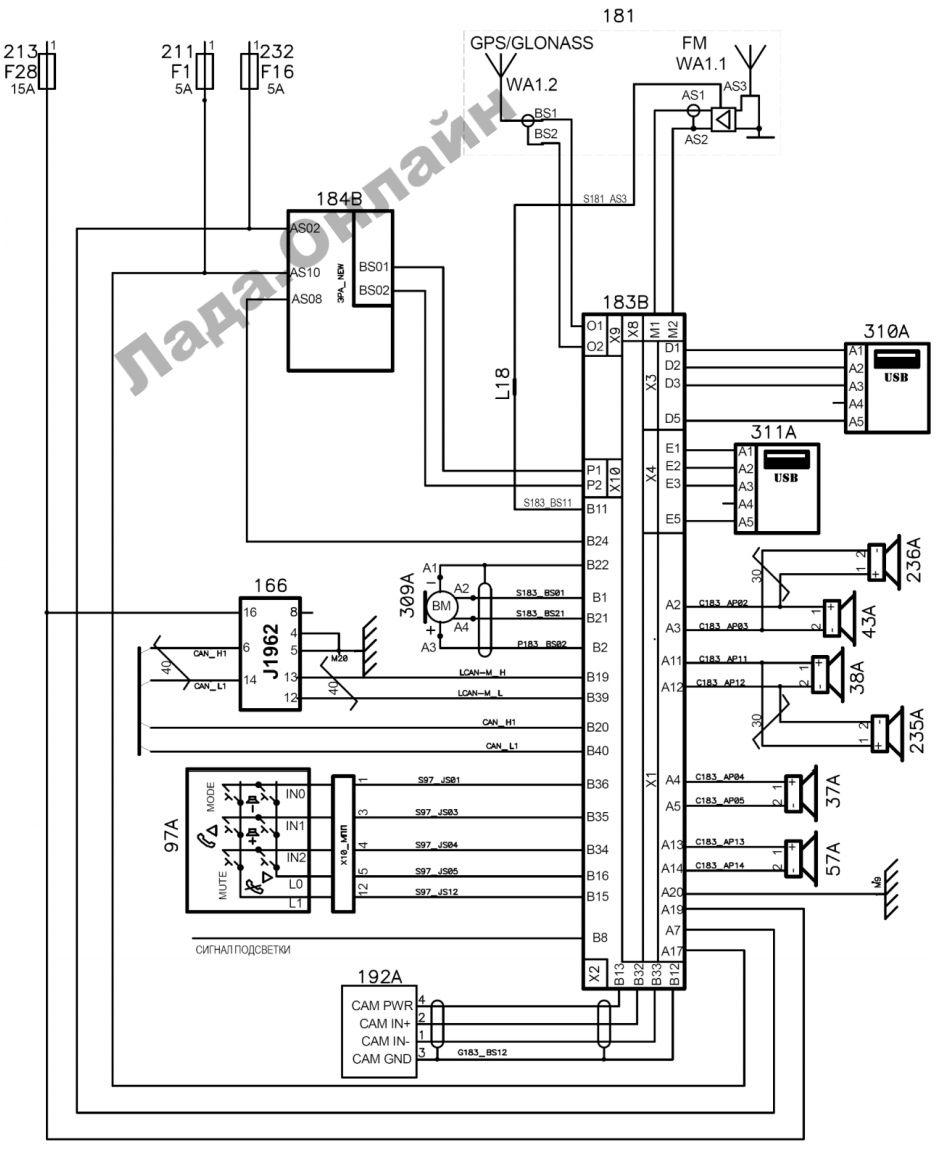 Принципиальная схема подключения ММС автомобилей VESTA: 37A – громкоговоритель задний левый; 38A – громкоговоритель передний правый; 43A – громкоговоритель передний левый; 57А – громкоговоритель задний правый; 97А – соединитель вращающийся; 166 – диагностический разъём; 181 – антенна комбинированная; 183B – оборудование мультимедийное (IVI); 184B – терминальный блок "ЭРА-ГЛОНАСС"; 192A – камера заднего вида; 235A – громкоговоритель высокочастотный правый; 236A – громкоговоритель высокочастотный левый; 309A – микрофон аудиосистемы; 211, 213, 232 – предохранители системы; 310A – разъём USB (мультимедиа); 311A – разъём USB (модем).