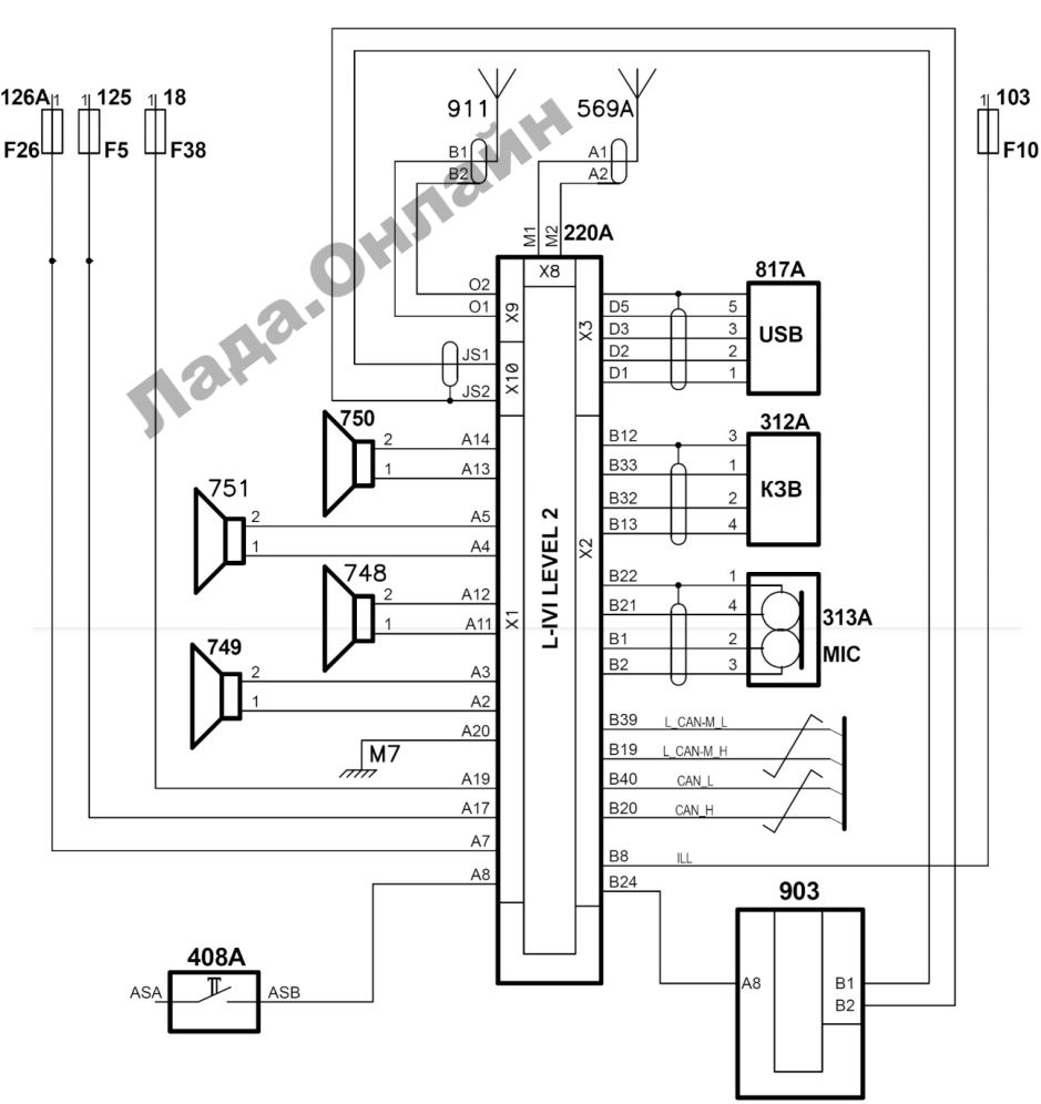 Принципиальная схема подключения ММС автомобилей GRANTA: 220A – оборудование мультимедийное навигационное (IVI); 312A – камера заднего вида; 313A – микрофон аудиосистемы; 408A – выключатель света заднего хода; 569A – антенна FM; 748 – громкоговоритель передний правый; 749 – громкоговоритель передний левый 750 – громкоговоритель задний правый; 751 – громкоговоритель задний левый; 817A – разъём USB; 903 – автомобильный терминал системы "ЭРА-ГЛОНАСС"; 911- антенна "ЭРА-ГЛОНАСС".