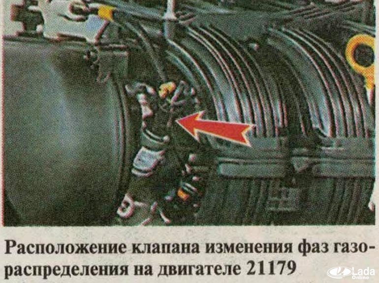 Клапан изменения фаз газораспределения находится в головке блока цилиндров с правой стороны. На двигателе ВАЗ-21179 клапан сверху закрывает декоративная накладка: