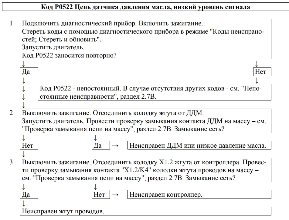 Код Р0522 Цепь датчика давления масла, низкий уровень сигнала