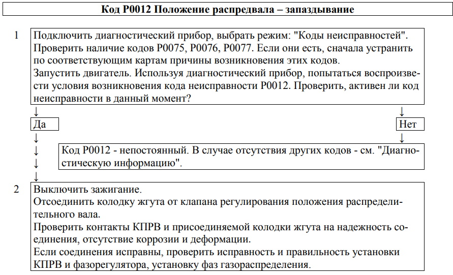 Неисправность непостоянного характера может быть вызвана ненадежным соединением контактов колодок жгута проводов к клапану регулирования положения распределительного вала или датчику фаз.