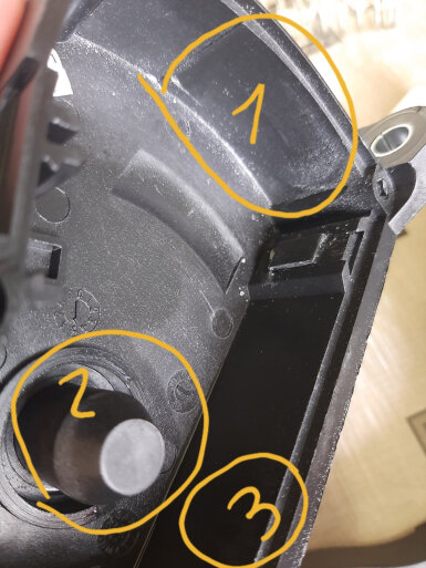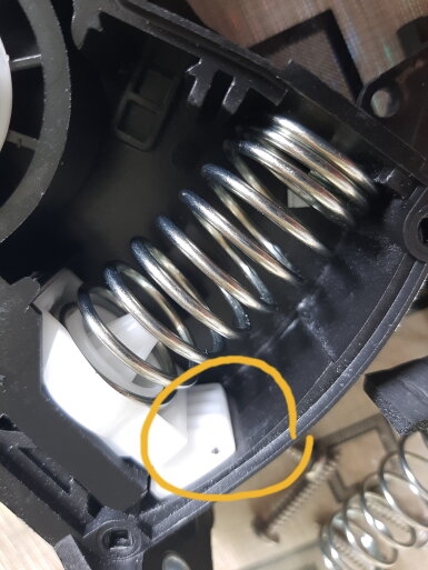 Разбираем корпус и обращаем внимание на место прилегания белого упора. Эта деталь издает посторонние звуки, когда трется о корпус. Для решения проблемы следует смазать места трения тонким слоем смазки.