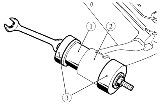 Установить на шарнир оправку 3, рисунок 13-12, для запрессовки и запрессовать шарнир в рычаг задней подвески оправка с маркировкой "2" из комплекта 67.7823-9715, ключи кольцевые 17, 19).