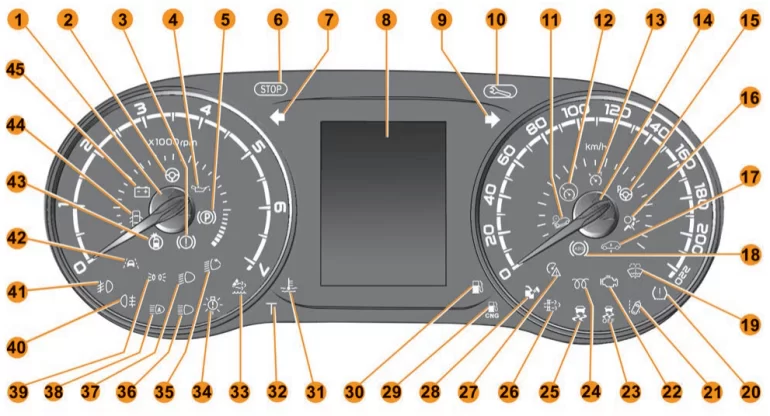 45 – сигнализатор разряда аккумуляторной батареи. Загорается при включении зажигания (режим «самотестирования»). Загорание сигнализатора при работающем двигателе означает нарушение нормальной работы системы электропитания автомобиля и указывает на неисправность системы зарядки аккумулятора, слабое натяжение/обрыв ремня привода генератора или неисправность самого генератора.