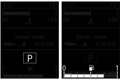 Число прямоугольных делений указывает на уровень топлива. При минимальном уровне топлива прямоугольные деления гаснут и в комбинации приборов загорается сигнализатор низкого уровня топлива.