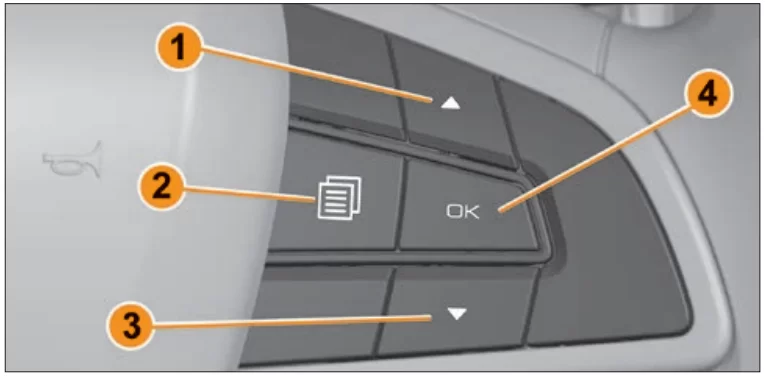 Управление бортовым компьютером осуществляется с помощью кнопок на дополнительном блоке управления рулевого колеса. Короткое нажатие кнопки 2 «Меню» вызывает выбор между двумя меню: «Меню информации автомобиля» и «Меню маршрута и расхода». Перемещение между этими меню осуществляется по короткому нажатию кнопки 2 «Меню». При коротких нажатиях на кнопки 1 «Вверх» или 3 «Вниз» на информационном дисплее последовательно