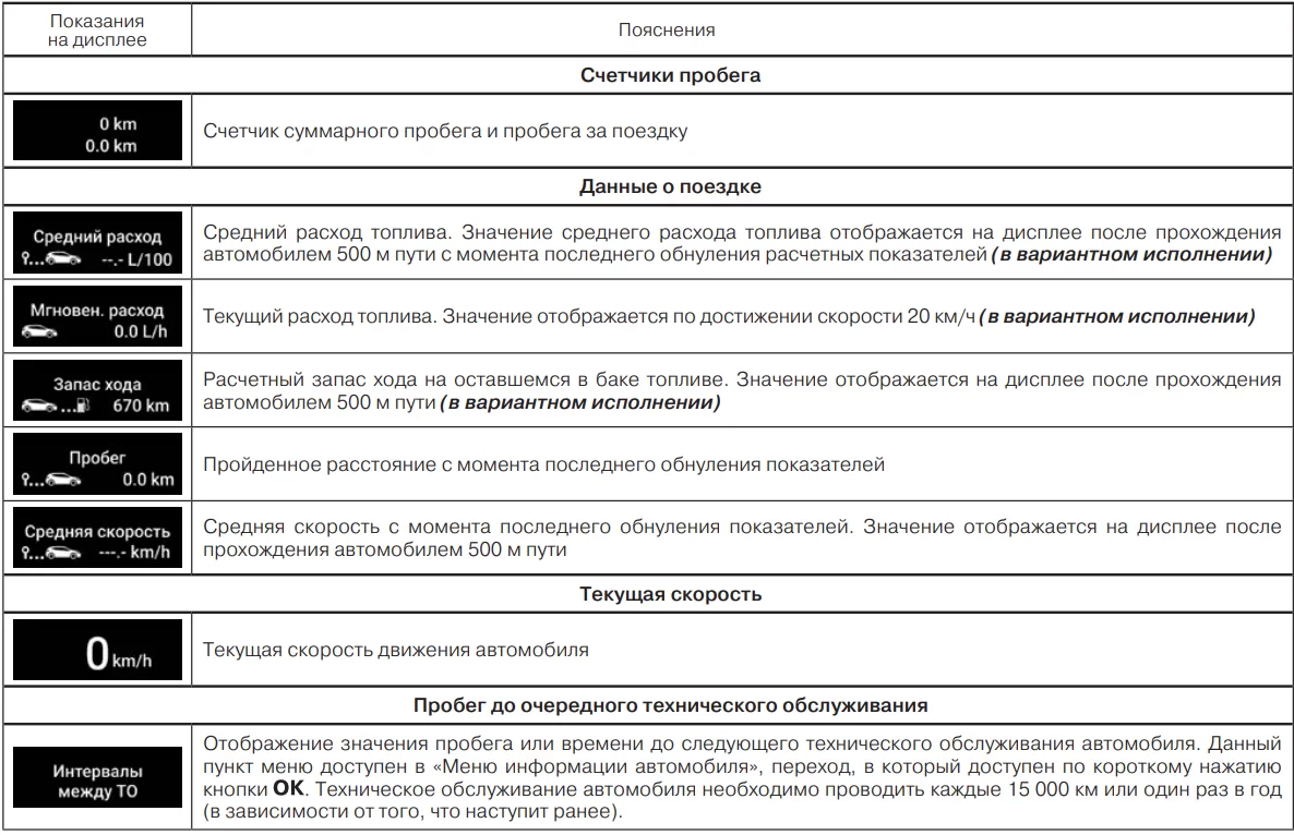 В вариантном исполнении бортовой компьютер отображает следующие показания: