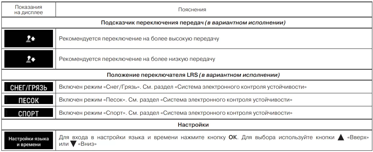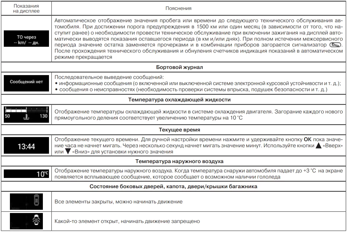 Данные сообщения играют роль подсказки при пуске двигателя, дают информацию о выборе или текущем состоянии систем управления автомобилем |
