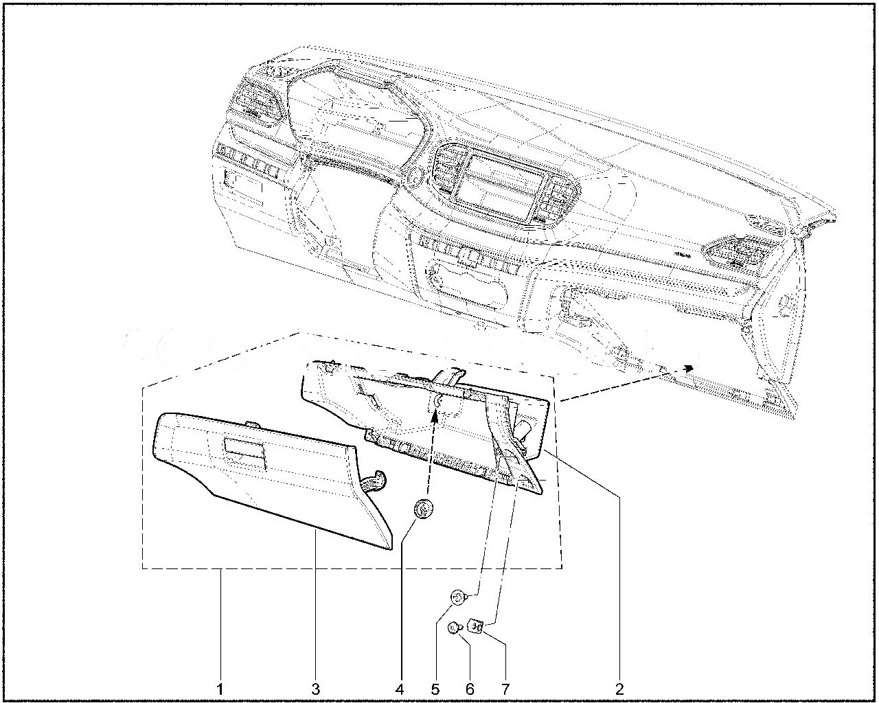 Открыть крышку вещевого ящика, отвернуть шесть винтов 2, рисунок 10-17, крепления вещевого ящика к панели 1 приборов, снять вещевой ящик, отсоединив колодку жгута проводов плафона освещения вещевого ящика от колодки жгута проводов панели приборов (головка сменная Torx 20, вороток).