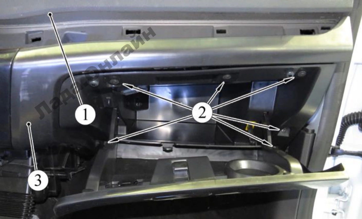 Рисунок 10-17 – Крепление вещевого ящика: 1 – панель приборов; 2 – винт крепления вещевого ящика; 3 – облицовка вещевого ящика