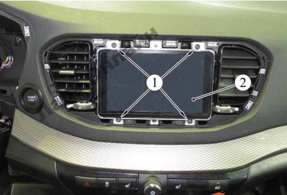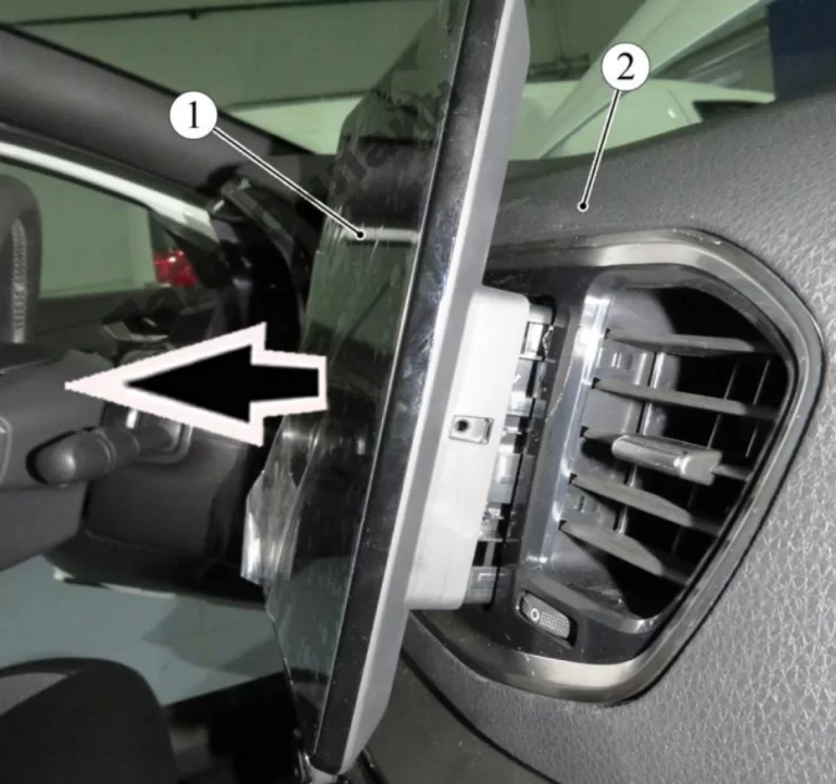 Рисунок 4-4 – Снятие монитора: 1 – монитор мультимедийной системы; 2 – панель приборов