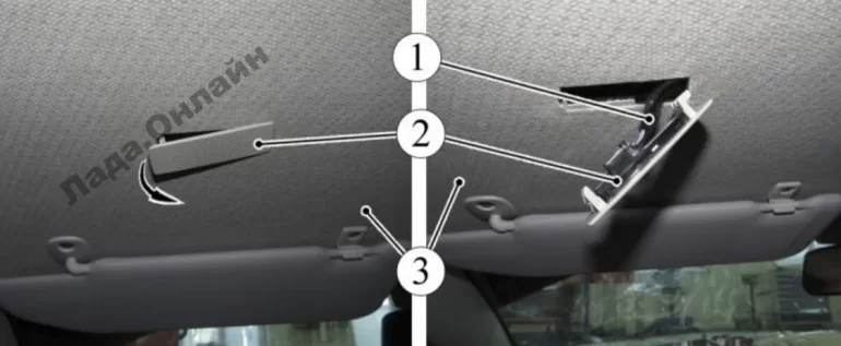 Рисунок 4-8 – Микрофон системы мультимедиа: 1 – жгут проводов;2 – микрофон; 3 – обивка крыши