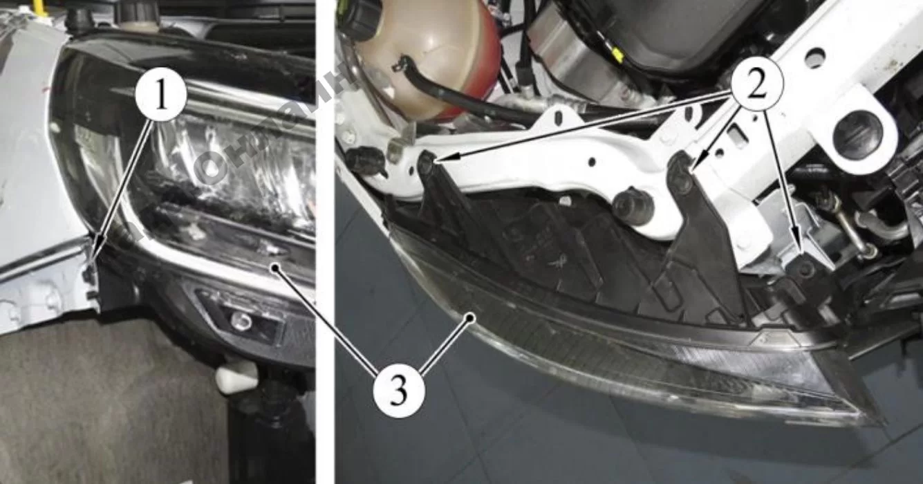 Рисунок 5-1 – крепление блок-фары: 1, 2 – болт крепления блок-фары;3 – блок-фара