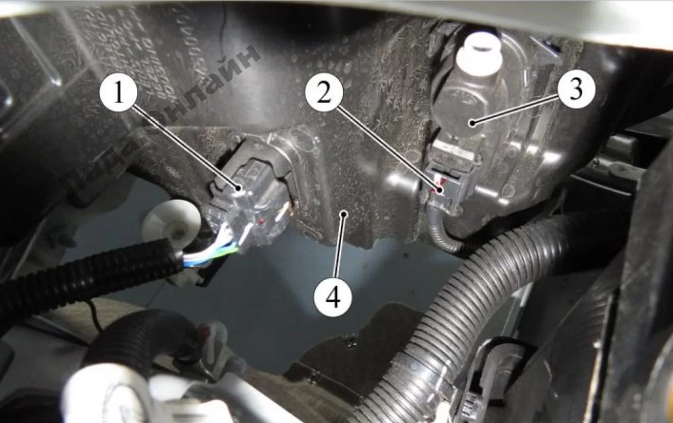 Рисунок 5-2 – Колодки жгута проводов к блок-фаре: 1 – колодка жгута проводов к блок фаре; 2 – колодка жгута проводов к корректору света фар; 3 – корректор света блок-фары;4 – блок-фара