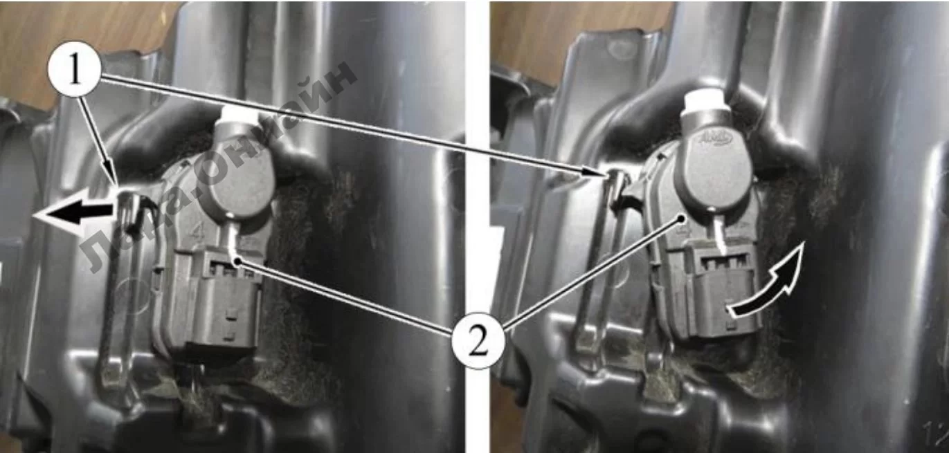 Рисунок 5-3 – Моторедуктор корректора света блок-фары: 1 – фиксатор моторедуктора; 2 – моторедуктор корректора света блок-фары