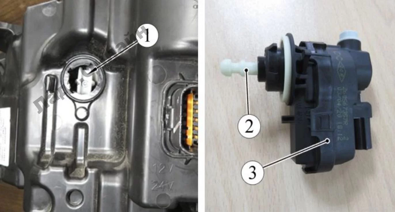 Рисунок 5-4 – Снятие моторедуктора блок-фары: 1 – держатель штока моторедуктора отражающего элемента; 2 – шток моторедуктора; 3 – моторедуктор корректора света блок-фары
