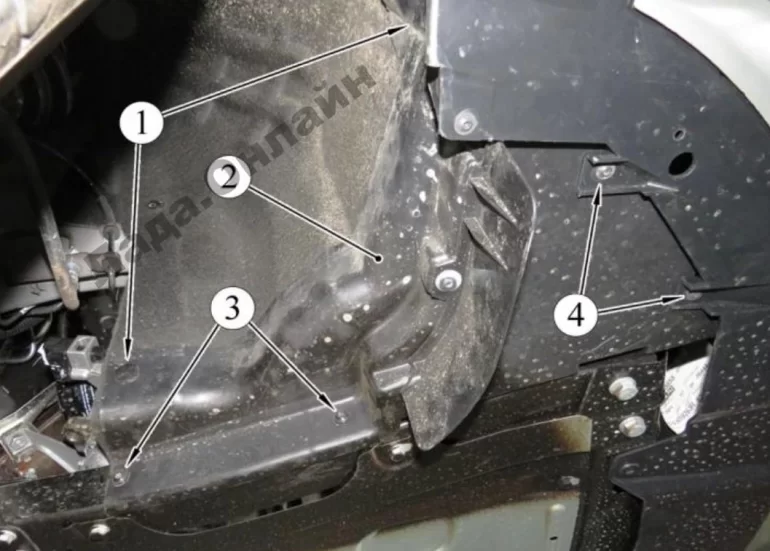 Рисунок 6-1 – Крепление экрана защитного переднего бампера: 1 – клипса; 2 – экран защитный; 3, 4 – винт крепления экрана