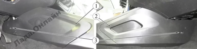 Отвернуть с правой и левой стороны винт 3, рисунок 9-4, крепления бокового экрана левого 1 и правого 2, преодолевая сопротивление пластмассовых держателей, снять экран (головка сменная Torx T20, вороток, приспособление для демонтажа обивок и декоративных элементов кузова или отвертка плоская с защищенным жалом).