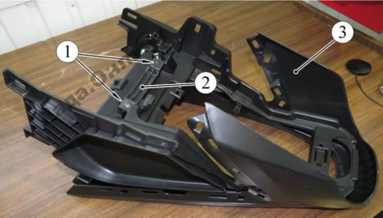 Рисунок 13-1 – Антенна бесключевого доступа центральная: 1 – винт крепления антенны; 2 – антенна бесключевого доступа; 3 – облицовка туннеля пола
