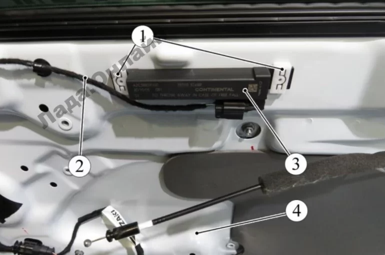 Рисунок 13-2 – Антенна бесключевого доступа двери: 1 – держатель антенны; 2 – жгут проводов двери; 3 – антенна бесключевого доступа; 4 – дверь задняя