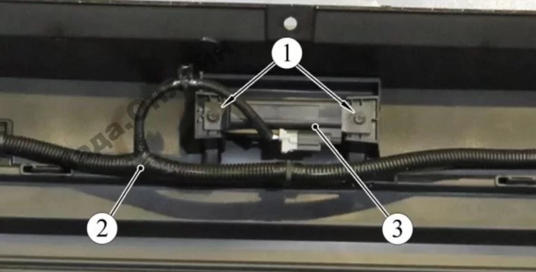 Рисунок 13-3 – Антенна бесключевого доступа двери: 1 – винт; 2 – жгут проводов бампера; 3 – антенна бесключевого доступа