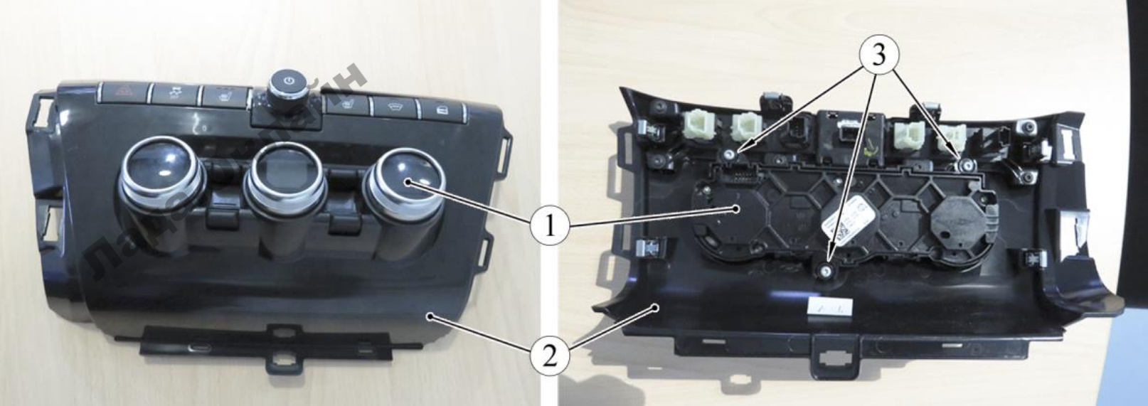 Рисунок 13-4 – Крепление электрического блока рукояток управления климатической установкой: 1 – блок рукояток управления климатической установкой; 2 – накладка консоли; 3 – винт крепления блока рукояток