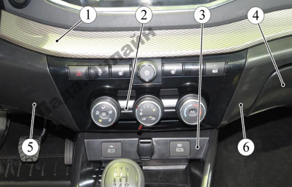 Рисунок 13-3 – Блок рукояток управления климатической установкой: 1 – накладка декоративная панели приборов; 2 – блок управления климатической установкой; 3 – панель розеток; 4 – вещевой ящик; 5 - облицовка панели приборов нижняя; 6 - облицовка вещевого ящика.